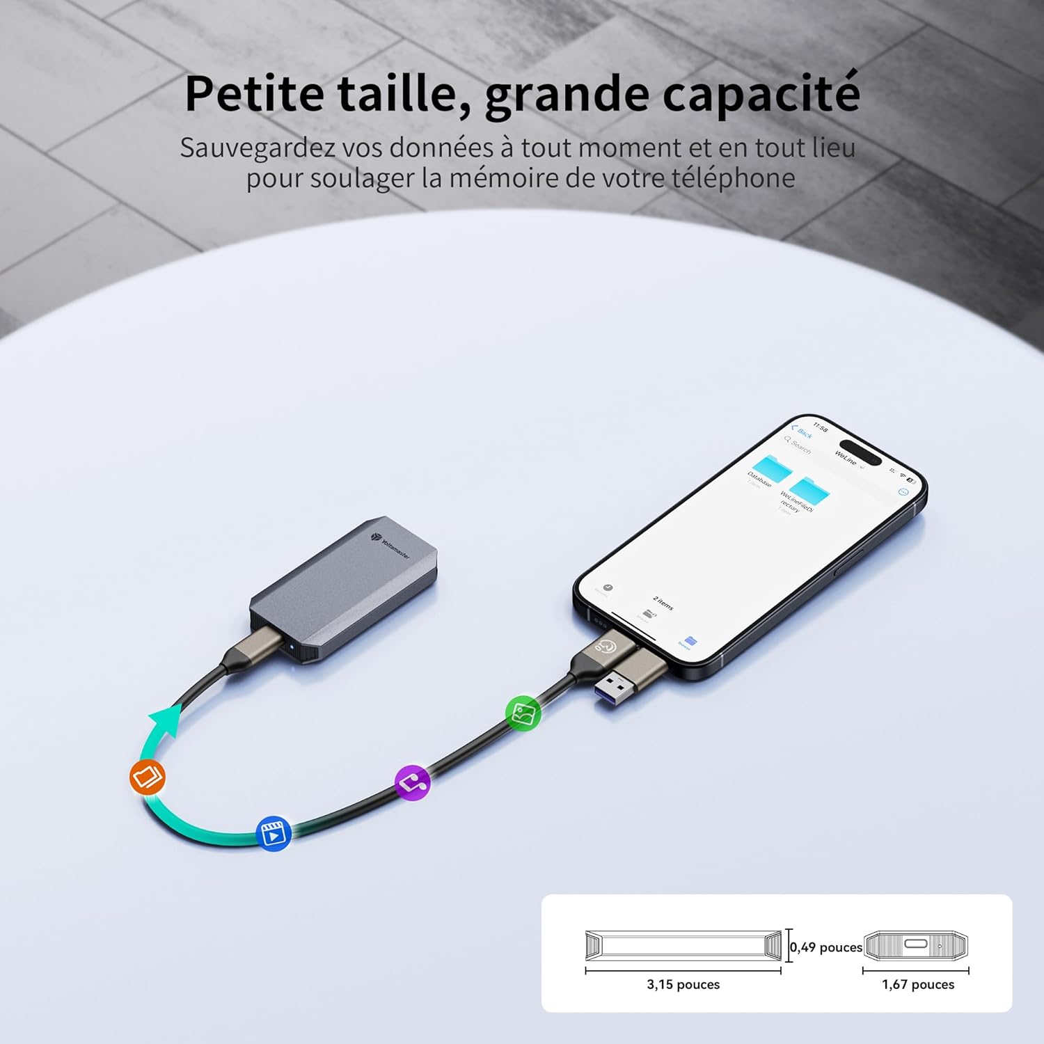 Disque SSD externe Yottamaster 1 To, jusqu’à 460 Mo/s, câble USB-C 2 en 1 et dragonne inclus, compatible 4K ProRes HDR, avec iPhone 17 Pro Max, smartphone, tablette et ordinateur portable