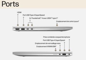 Malgré son format compact, le PC portable HP Elite x360 1040 G10 offre la connectique dont vous avez besoin au quotidien avec notamment 2 ports USB Type C compatibles Thunderbolt et 1 connecteur HDMI. Pour votre confort, cet ordinateur portable HP dispose aussi d’un clavier à touches rétroéclairées.