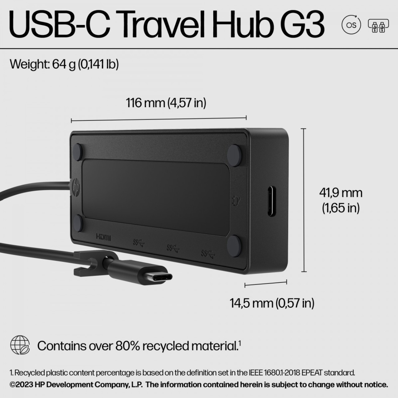 HP Concentrateur USB-C de voyage G3. Interface de l’hôte: USB 3.2 Gen 2 (3.1 Gen 2) Type-C, Délivrance de la puissance USB jusqu’à: 65 W. Taux de d’actualisation maximal: 60 Hz, Interfaces Hub: HDMI, USB 3.2 Gen 2 (3.1 Gen 2) Type-A, USB 3.2 Gen 2 (3.1 Gen 2) Type-C, Pays d’origine: Viêt Nam. Prise en charge du système d’exploitation Windows: Windows 10, Windows 11, Prise en charge du système d’exploitation Mac: MacOS, Prise en charge d’autres systèmes d’exploitation: ChromeOS, Android, iPadOS. Largeur: 116 mm, Profondeur: 41,9 mm, Hauteur: 14,5 mm. Largeur du colis: 175 mm, Profondeur du colis: 60 mm, Hauteur du colis: 40 mm